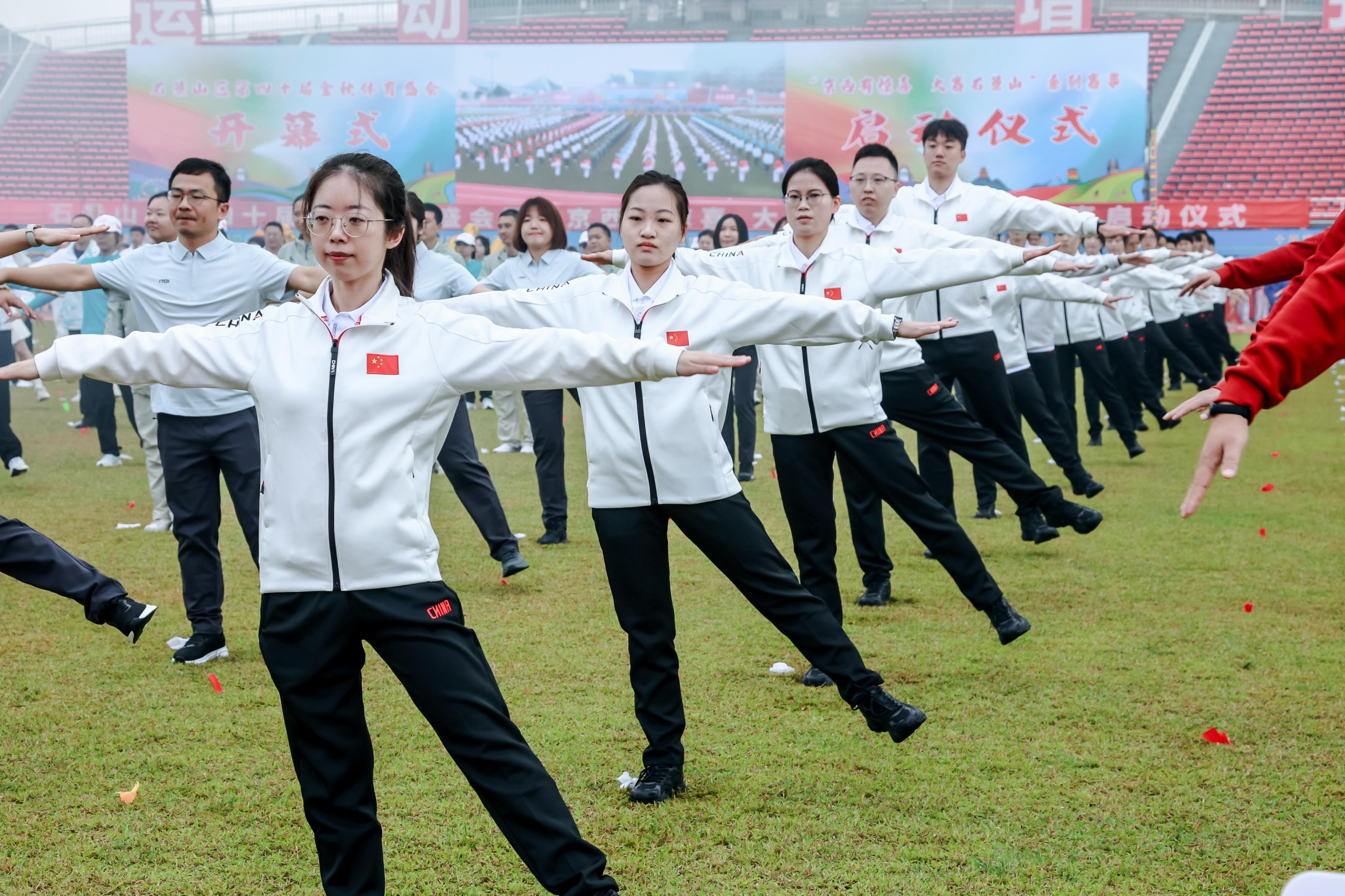 本届金秋体育盛会开幕式分为入场式与大型表演两个环节,来自石景山区的42家机关、企事业单位的千余名代表依次入场,以各具特色的展示展现了全区各行各业的精神风貌。随后的大型表演亮点频现:广播操展示评比由机器人“领操员”带队,将传统健身项目与科技元素完美融合;非遗表演《舞韵华章》由舞龙与龙烟太鼓、太极功夫扇、健身气功、霸王鞭与空竹、武术集锦五大元素组成闻喜策略,引得观众阵阵叫好;最后登场的《盛世中华》以打击乐、舞蹈结合机器人展示,尽显“双奥之区”的活力与风采。