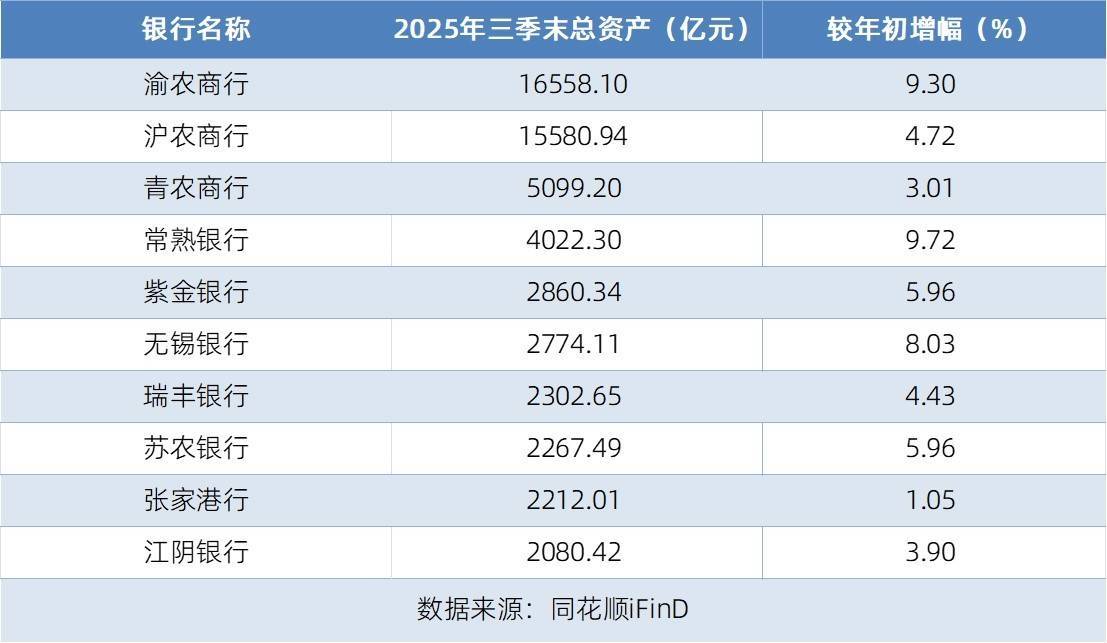 从总资产规模看,这10家银行呈现出清晰的梯队格局。渝农商行、沪农商行以超过1.5万亿元的体量稳居第一梯队,遥遥领先。青农商行、常熟银行则以突破4000亿元的规模位居第二梯队。紫金银行、无锡银行、苏农银行及江阴银行等6家银行的资产规模在2000-3000亿元区间。从增长动能看,常熟银行、渝农商行与无锡银行表现最为强劲,总资产较年初增幅分别达到9.72%、9.30%和8.03%,显著高于同业,展现出积极的业务扩张态势。
