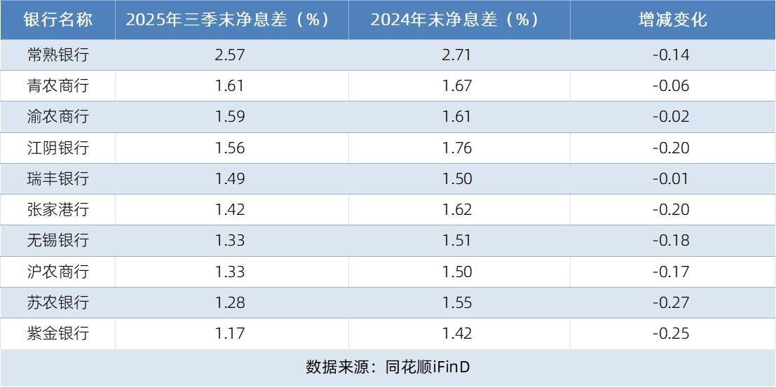 尽管同样面临下行压力,但常熟银行的净息差水平依然领先,其2.57%的数值远高于其他同业,甚至超过位列第二的青农商行近1个百分点。反观苏农银行与紫金银行,其息差已降至1.3%以下的低位,这无疑将直接挤压其核心利息收入空间,对其盈利能力的可持续性构成严峻考验。