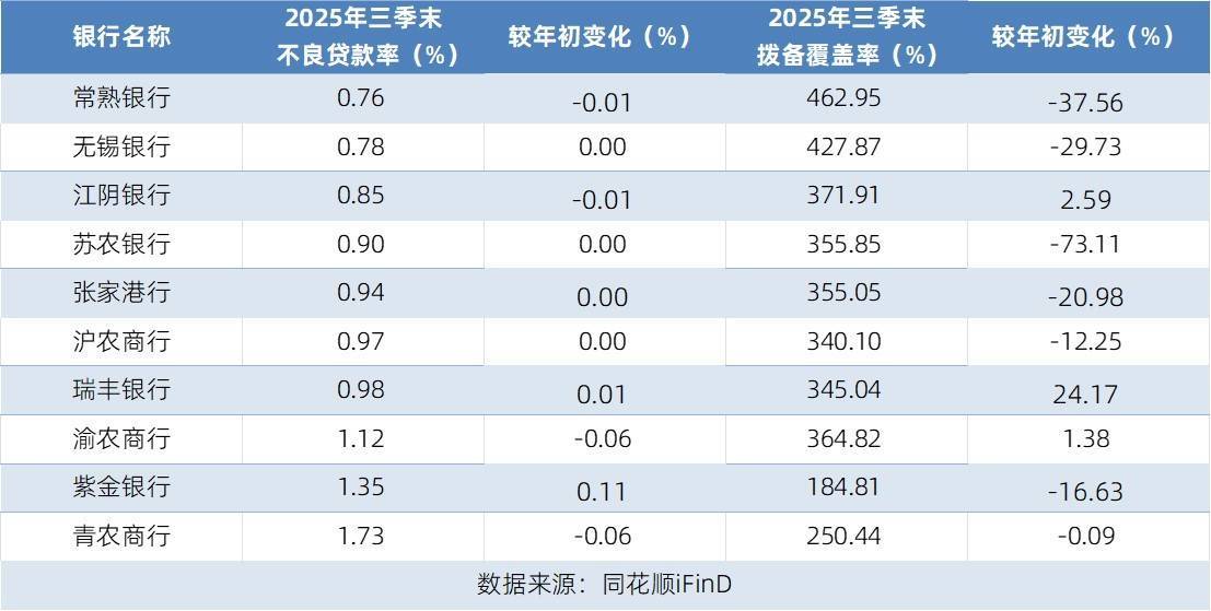 拨备覆盖率是衡量银行风险抵御能力的关键指标。多数银行拨备覆盖率远超监管要求,风险缓冲垫厚实,如常熟银行、无锡银行的拨备覆盖率均超过400%。然而,动态变化更值得关注。与上年末相比,超过半数银行的拨备覆盖率出现下滑,其中苏农银行大幅下降73.11个百分点,紫金银行的拨备覆盖率达184.81%,排在10家银行相对靠后的位置。